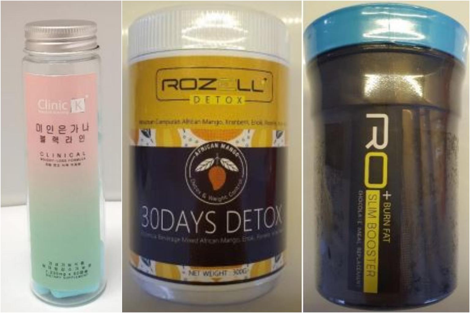 The products Clinic K and RO Slim Booster both contain sibutramine, a banned substance that could increase the risk of heart attack and stroke, while Rozell Detox contains a potent laxative sennoside.