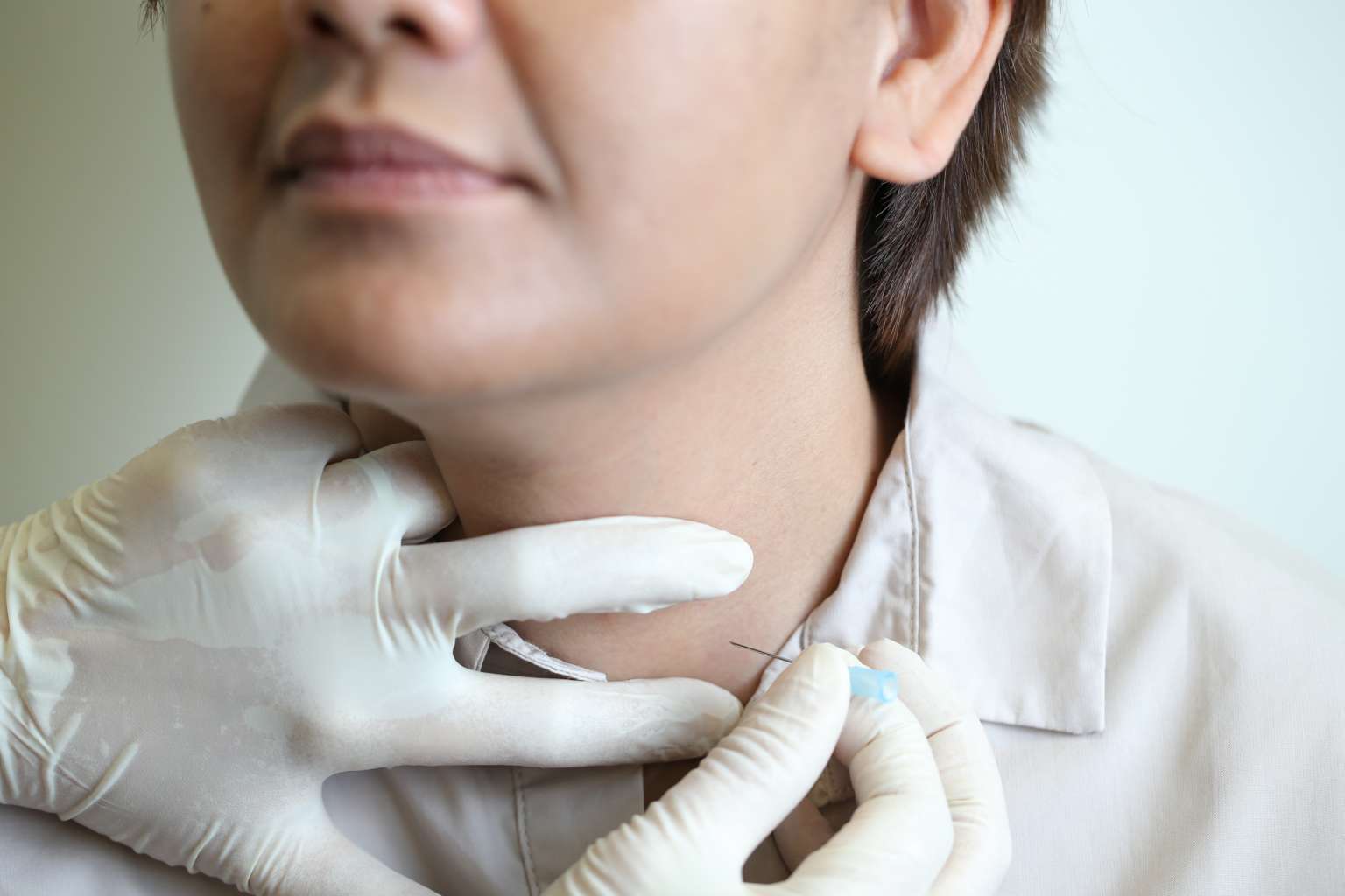 A pathologist showing how a very small needle is used to collect a sample of cells from the thyroid nodule.