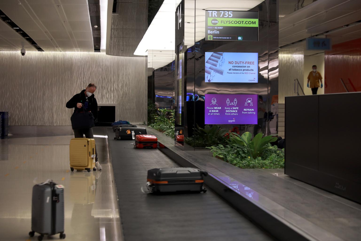 A VTL flight traveller collecting luggage at Changi Airport Terminal 1 on Nov 6, 2021.