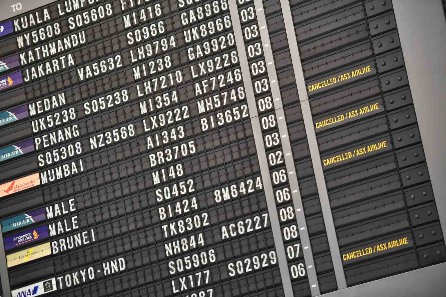 The flight information board at Changi Airport’s Terminal 2 showing flight cancellations on March 23, 2020, as border controls around the world tightened over the past week to stem the Covid-19 outbreak.