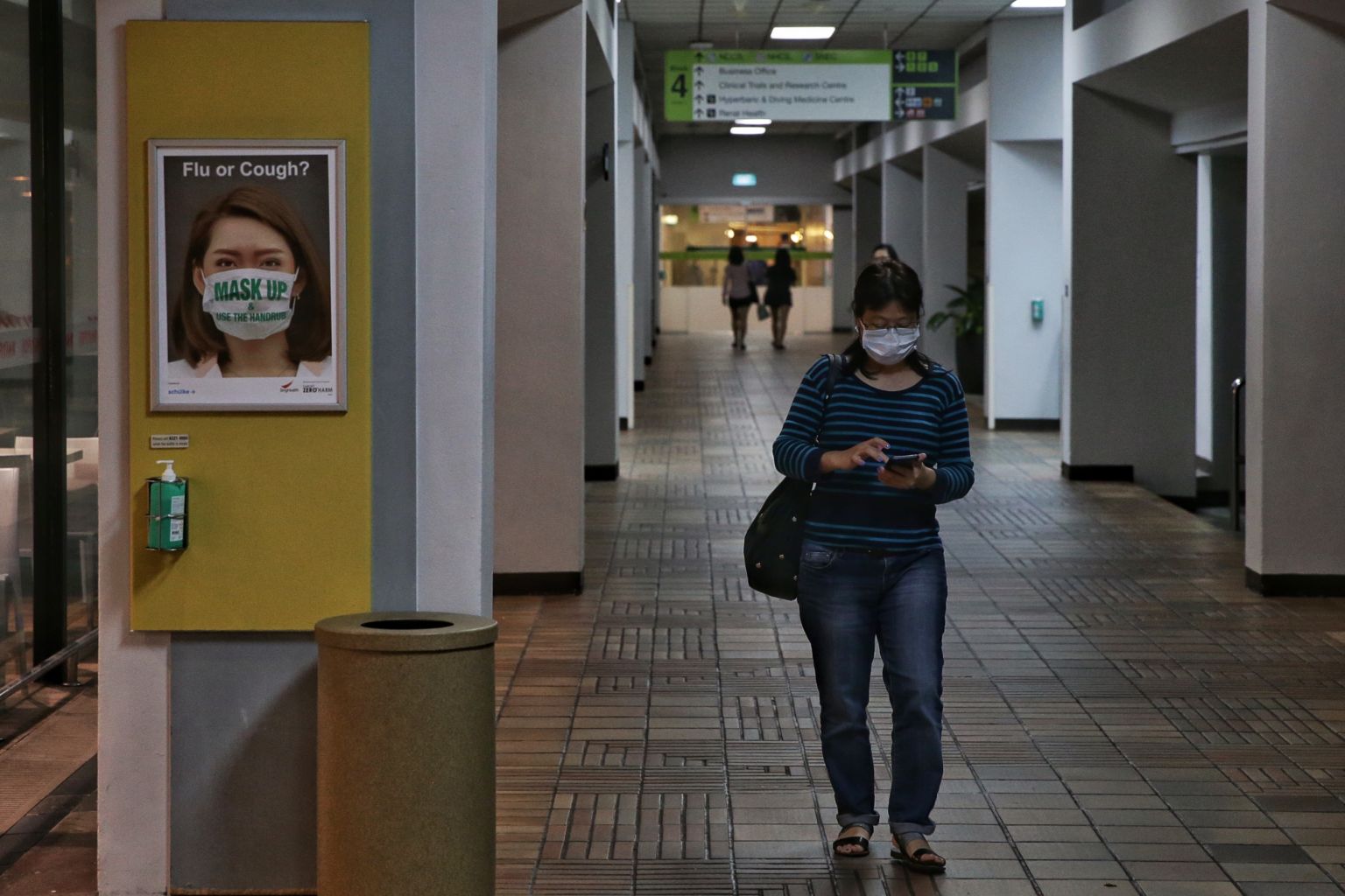 A woman wearing a face mask walks past a poster in Singapore General Hospital on Jan 23, 2020.