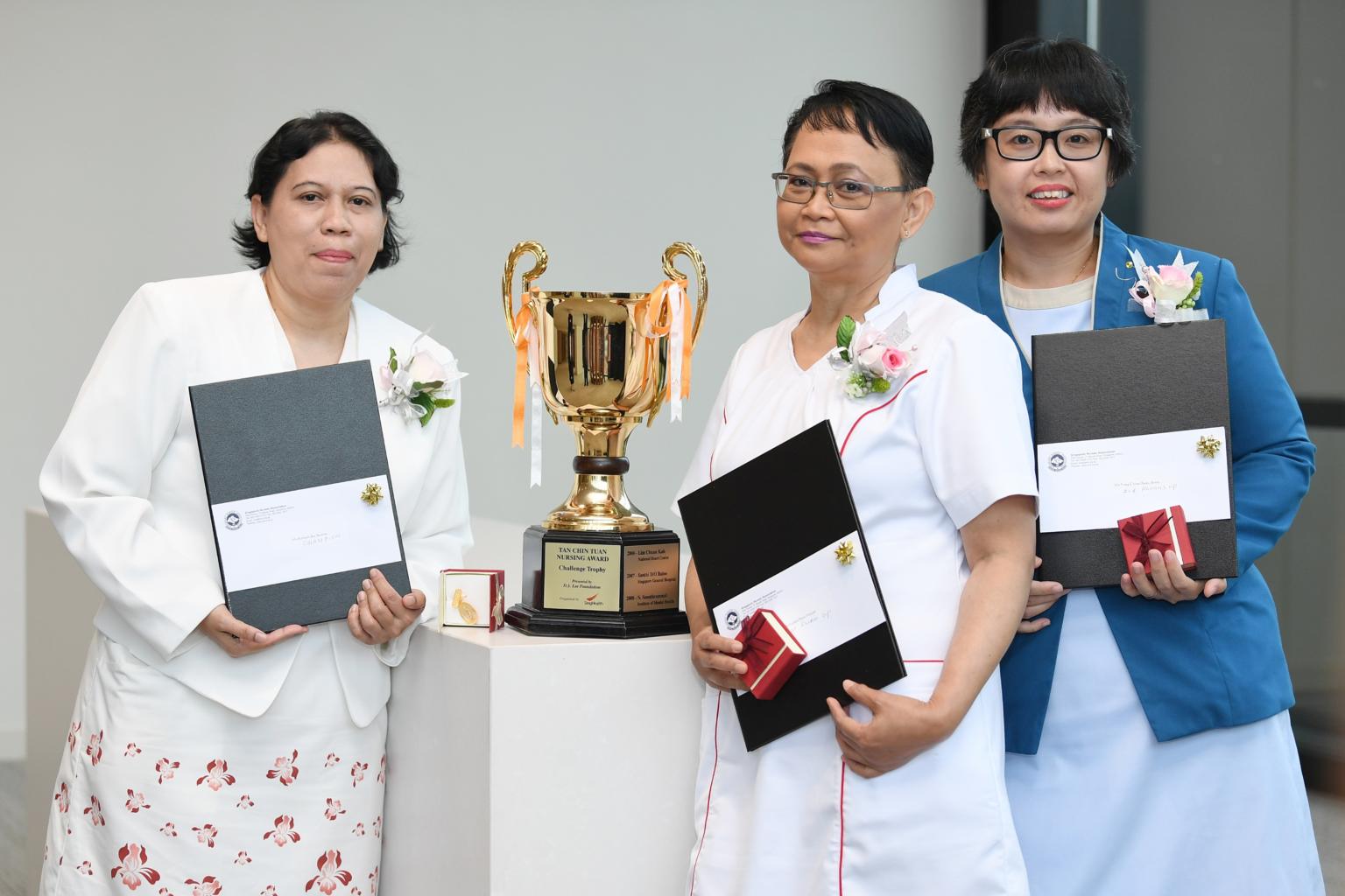 The awards were presented to the nurses on Friday by Senior Minister of State for Law and Health Edwin Tong, Ms Chew Gek Khim, who chairs The Straits Trading Company and is Mr Tan's granddaughter, and Dr Della Lee, who founded the award in 2005.