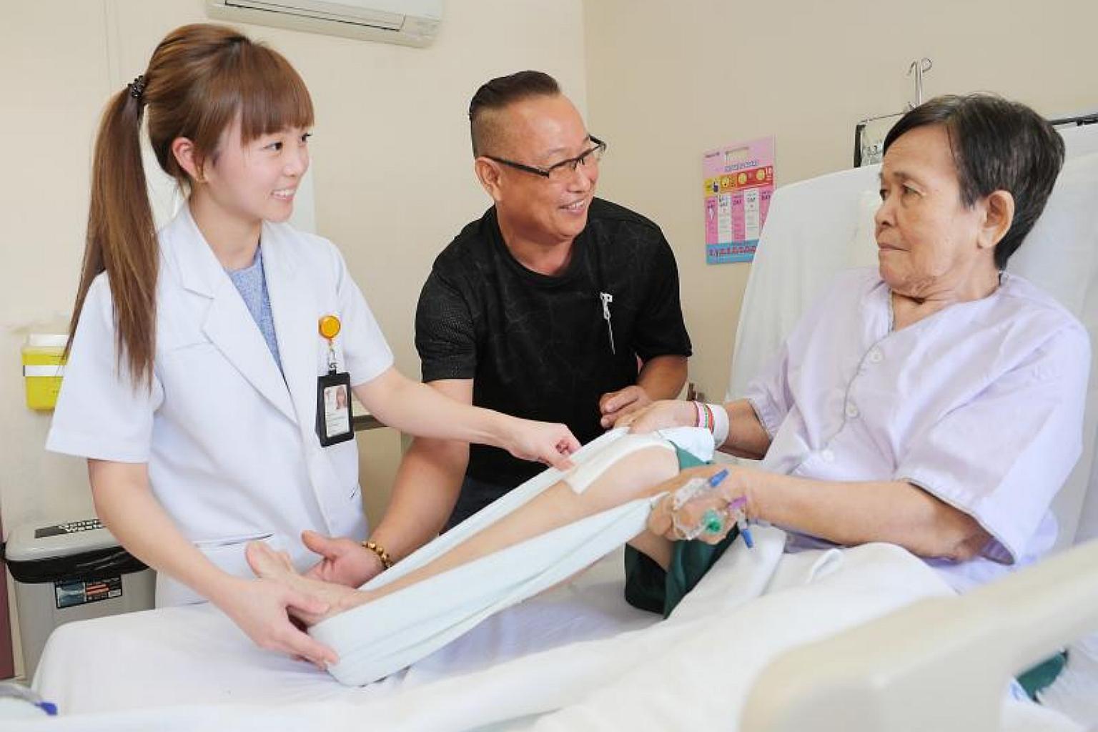 A patient who wanted to be known only as Madam Chong underwent a total knee replacement surgery on Monday and said she is open to having volunteers guide her in exercises.