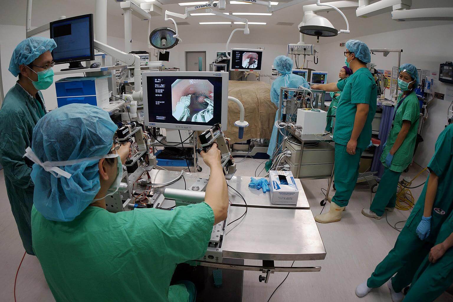 Doctors performing a surgery to remove tumours from a stomach cancer patient.