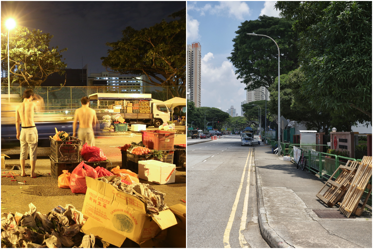 Stalls at the wholesale market in 2019 (left), and the site of the market on Sept 9, 2021.