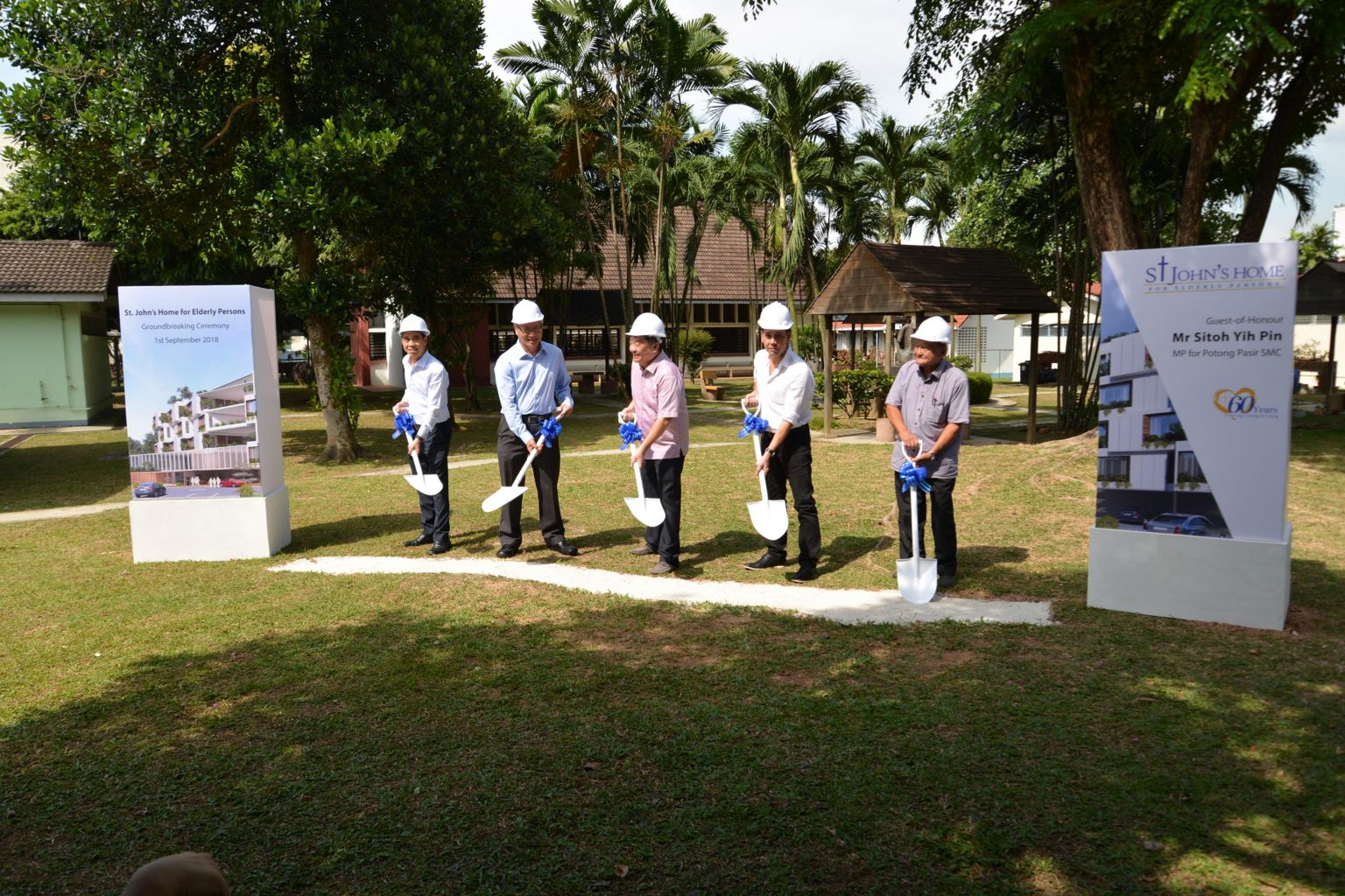 (From left) Lim Wen Heng Construction managing director Harry Lin, St. John's Home for Elderly Persons chairman Woon Wee Yim, MP for Potong Pasir Sitoh Yih Pin, Aamer Architects principal architect Aamer Taher, and St. John's Home resident Lim Seng Kim at the ground-breaking ceremony, on Sept 1, 2018.