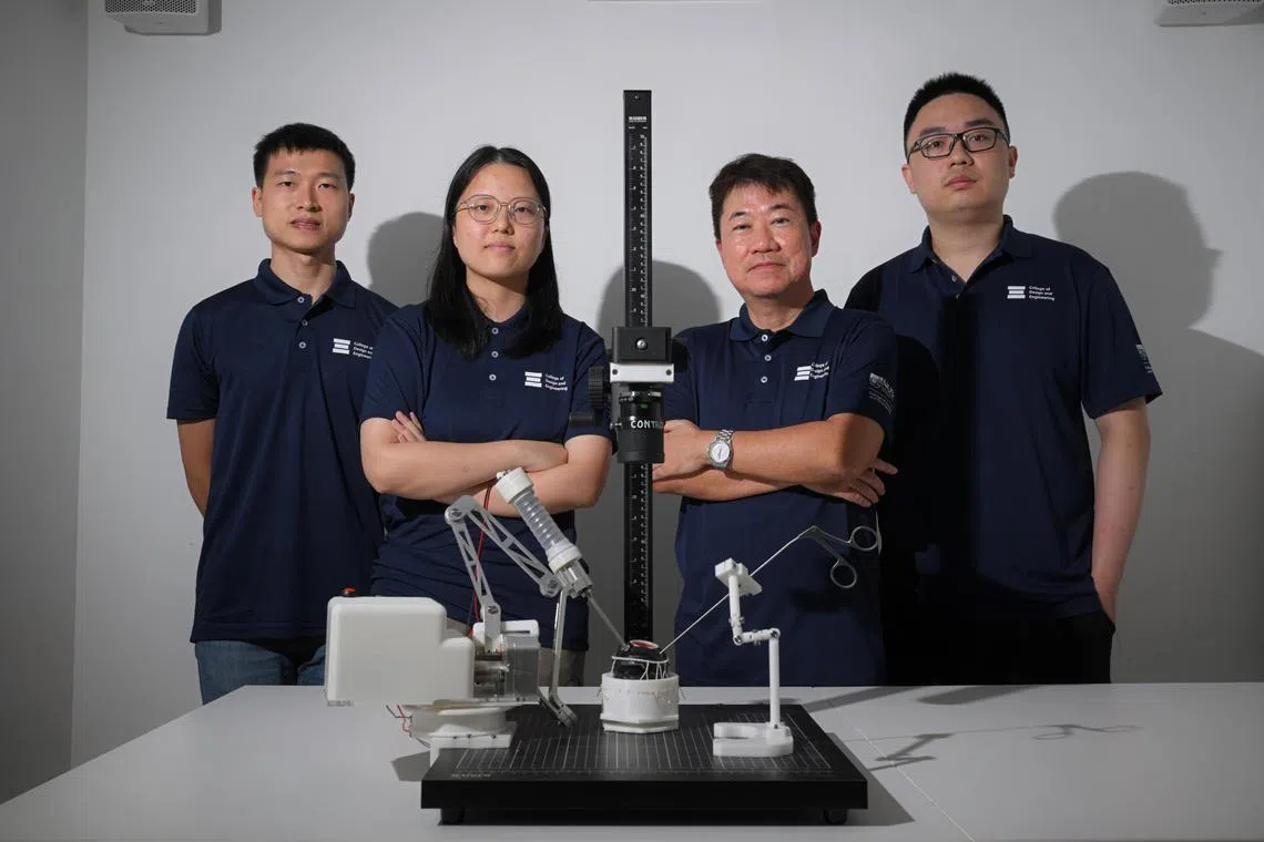 (From left) The NUS team behind the AI-powered robot-assisted microsurgical system include mechanical engineering PhD student Zhang Ziwei, 33, research engineer Lin Wenjun, 26, mechanical engineering associate professor Chui Chee Kong, 57, and mechanical engineering PhD student Zhang Wending, 25.