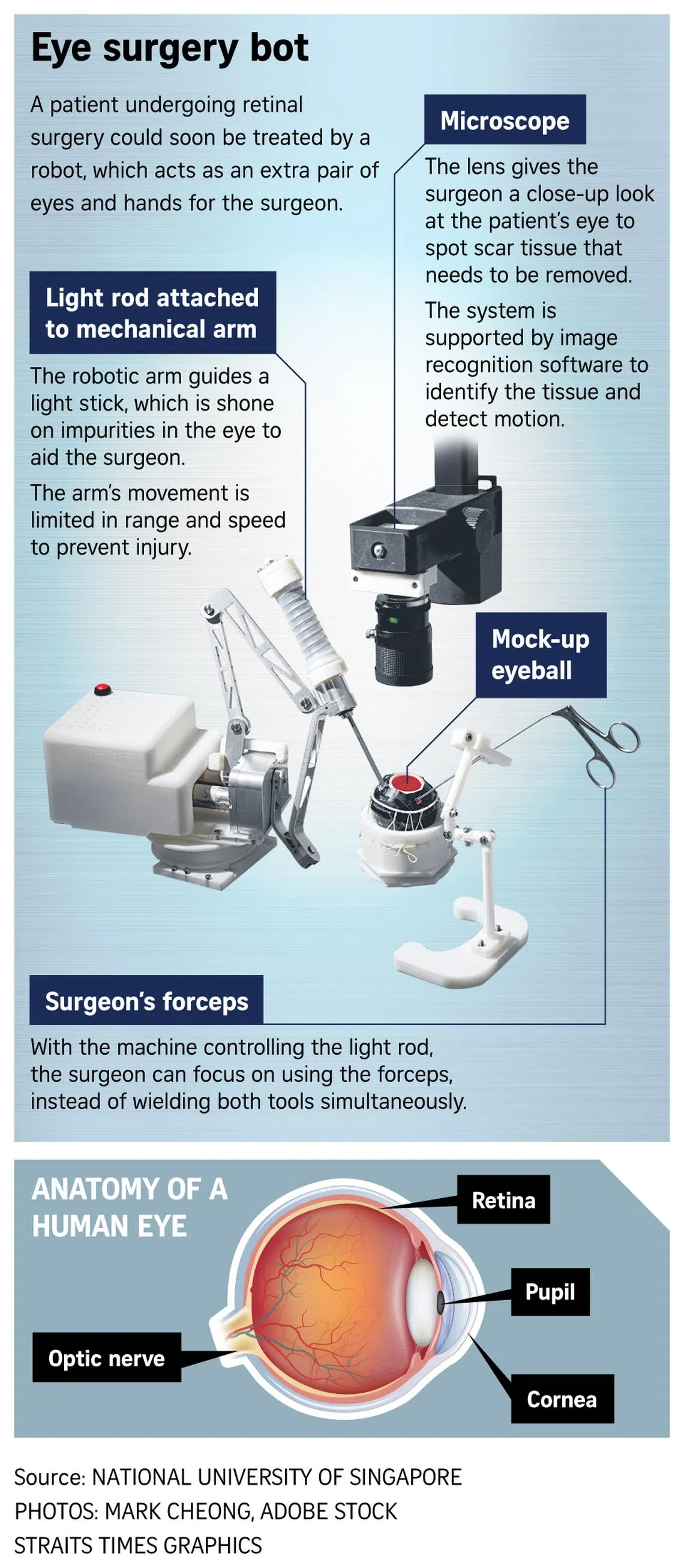 The school aims to provide projects like the eye surgery bot with a pathway to commercialisation and deployment outside of the lab, Professor Teo told The Straits Times during a preview on March 4.
