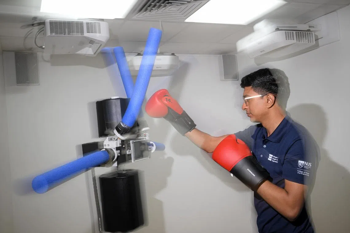 Mr Mageshkumar Kirubasankar, 26, who was in charge of the mechanical design of the project, demonstrates the BoxBunny, a boxing training robot.