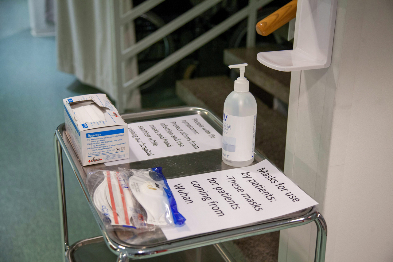 Masks and hand sanitiser on a tray at a health centre in Ivalo, Finland, on Jan 24, 2020.