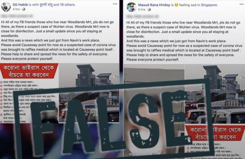 As misinformation swirled online about the virus, two posts circulating on Facebook told people to avoid the Woodlands MRT station, claiming a suspected case was discovered there.