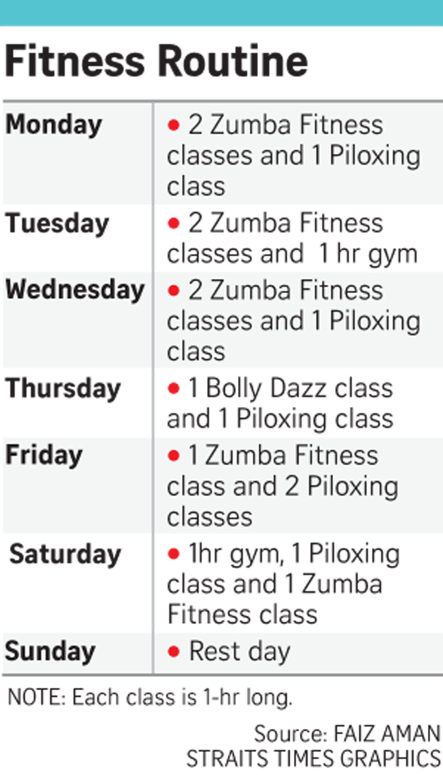 I am also certified by the Aerobics and Fitness Association of America (in Singapore) to teach piloxing (an interval training programme that combines the elements of boxing, standing pilates and dance) and Bolly Dazz (a Bollywood-inspired dance fitness programme).