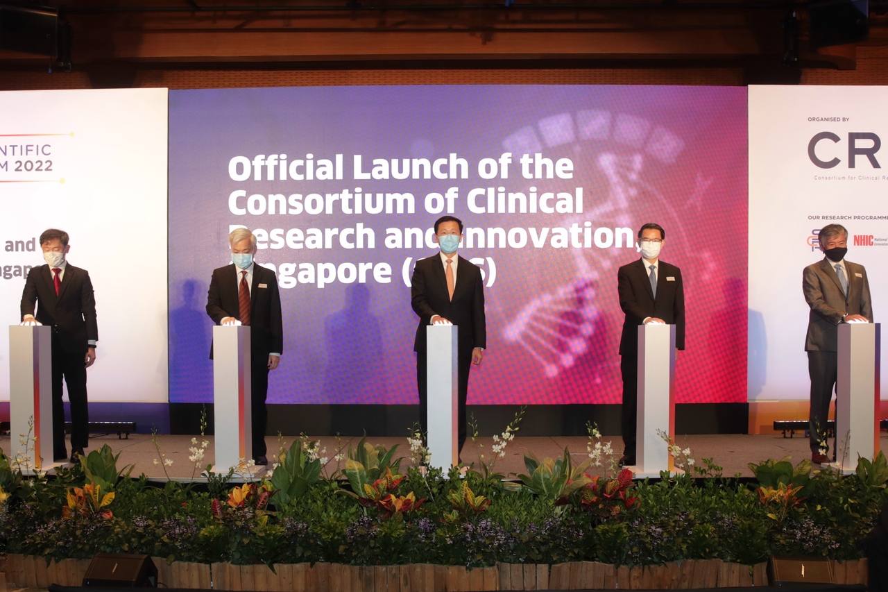 Health Minister Ong Ye Kung (centre) at the launch of the Consortium for Clinical Research and Innovation, Singapore.