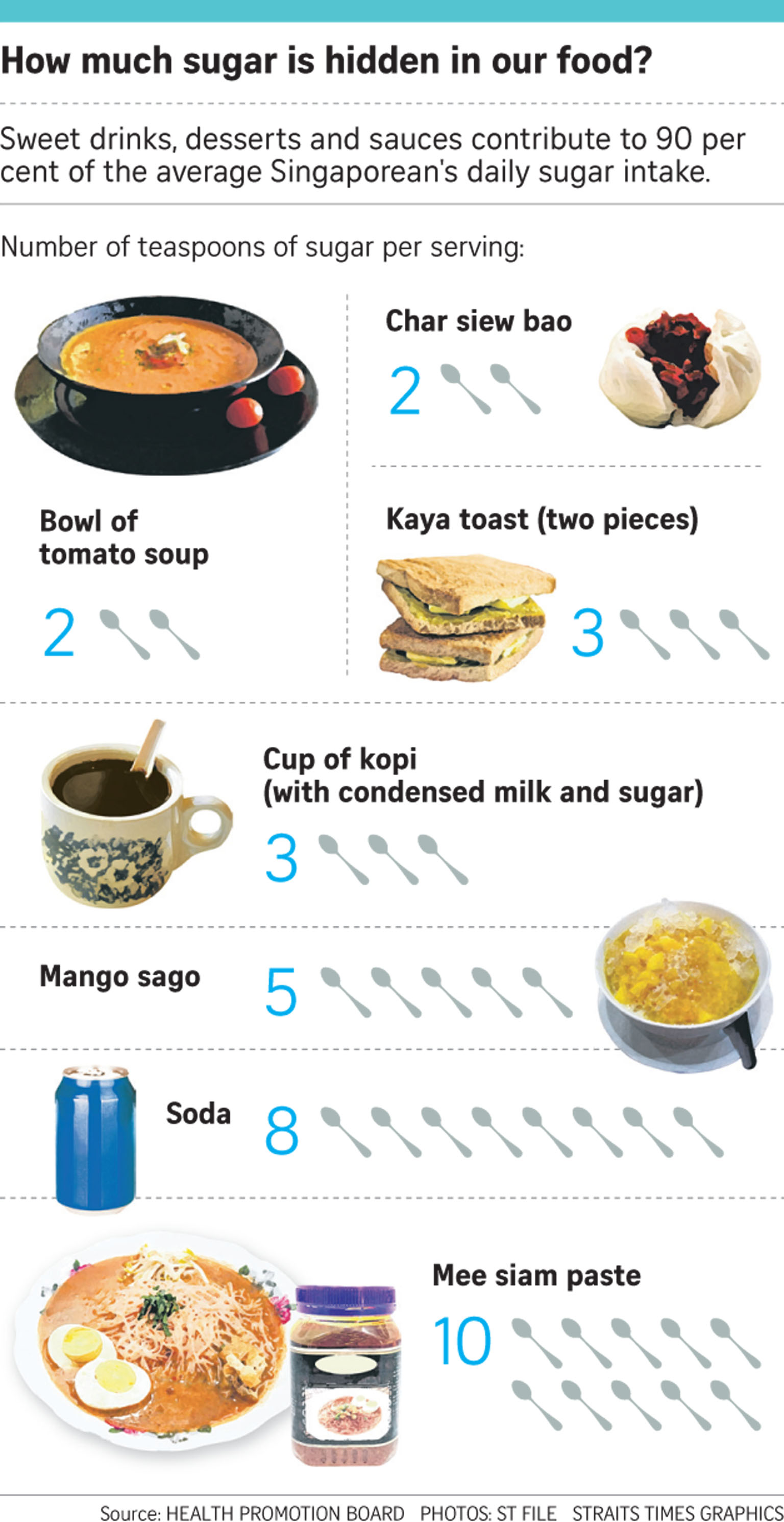 An average Singaporean consumes 12 teaspoons of sugar a day. The recommended daily intake is nine to 11 teaspoons.