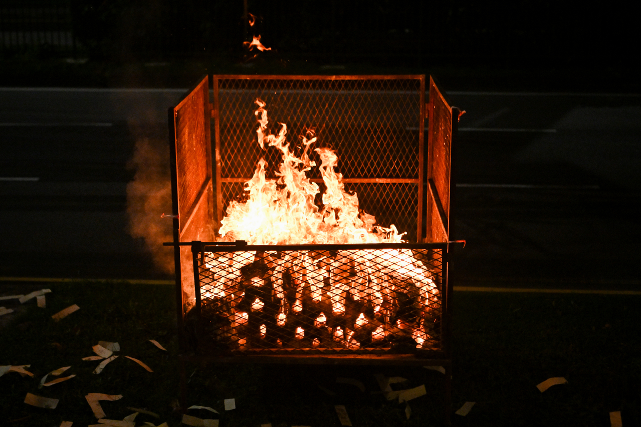 Joss paper burning inside burner near block 105, Lorong 1 Toa Payoh on July 29, 2022.