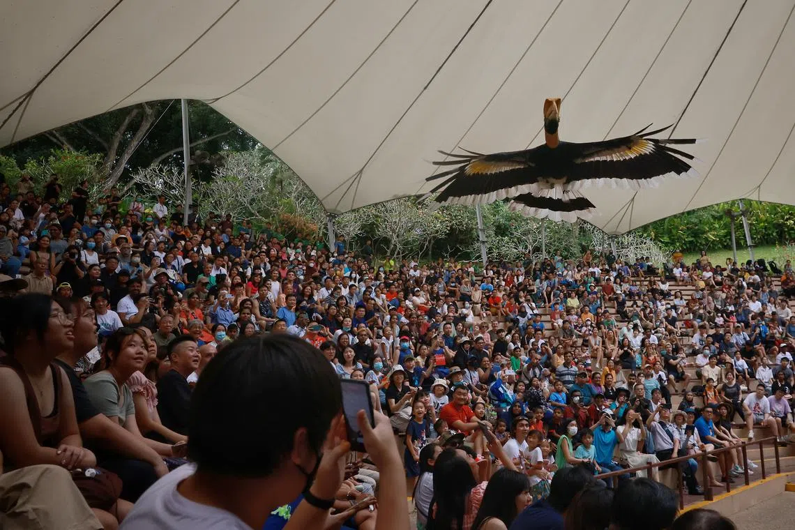 Earlier in the day at the Pools Amphitheatre, the significance of the last High Flyers show, another crowd favourite, appeared not to be lost on Chucky, a bantam rooster. After staring at the audience, it flew off its perch and onto presenter Eileen Lim’s arm – after some coaxing.