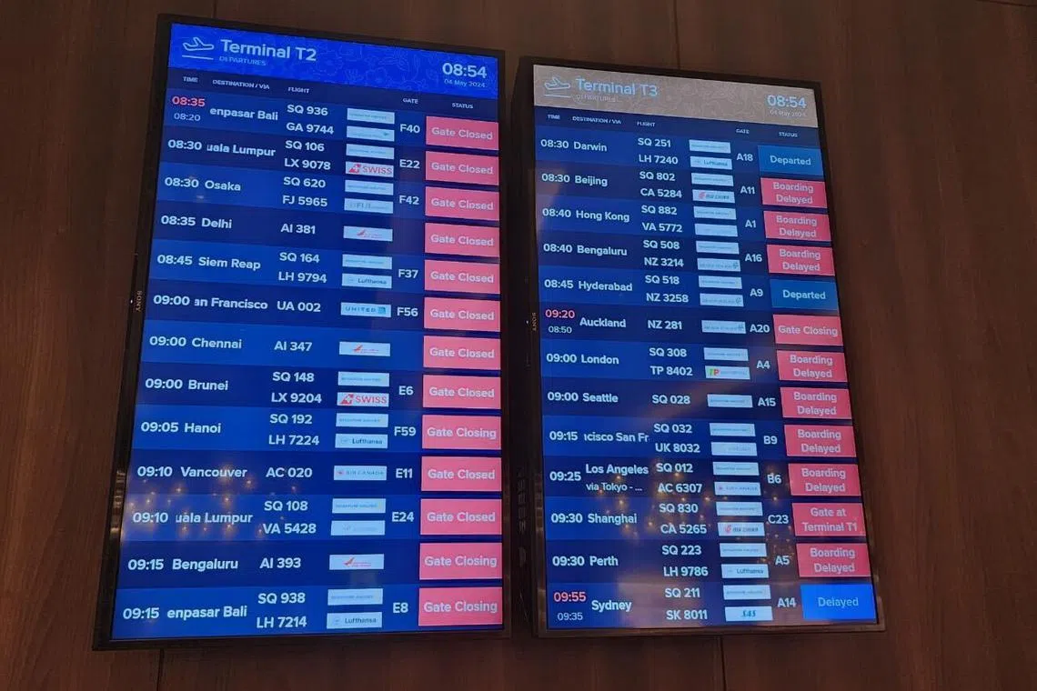 A photo of a flight information board at Changi Airport taken just before 9am on May 4 showing at least eight flights delayed at Terminal 3.