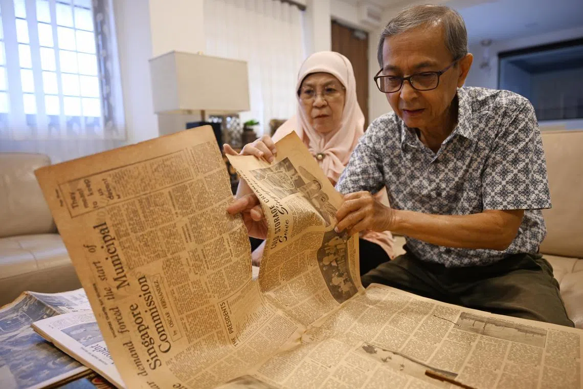 We are in Mr Hassim’s cosy Housing Board flat in Choa Chu Kang on a rainy March afternoon, and he and his wife, Ms Hernie Lim, 71, are traversing time through copies of The Straits Times laid out on their coffee table.