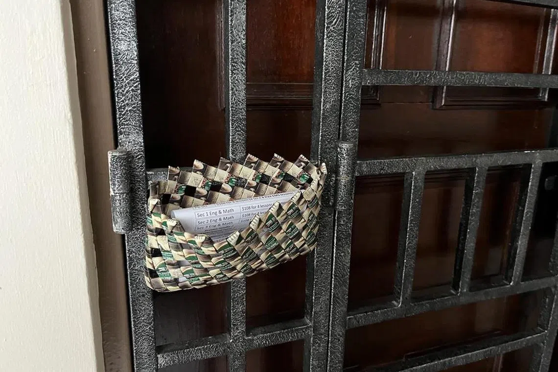 A plastic basket being used to store fliers and small parcels at an HDB unit in Tampines.