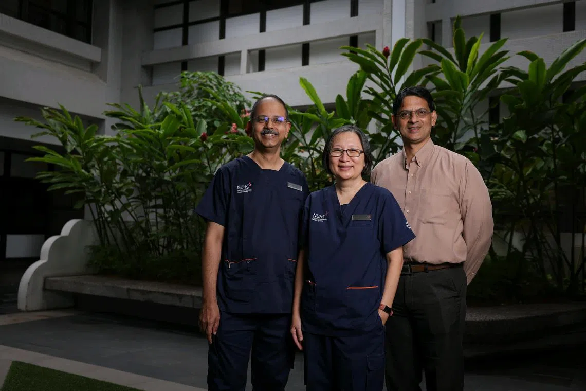 The team that carried out the transplant and managed Elvia Lim’s MSUD: (from left) Adjunct Associate Professor Vidyadhar Mali, Associate Professor Denise Goh, and Assistant Professor S. Venkatesh Karthik.