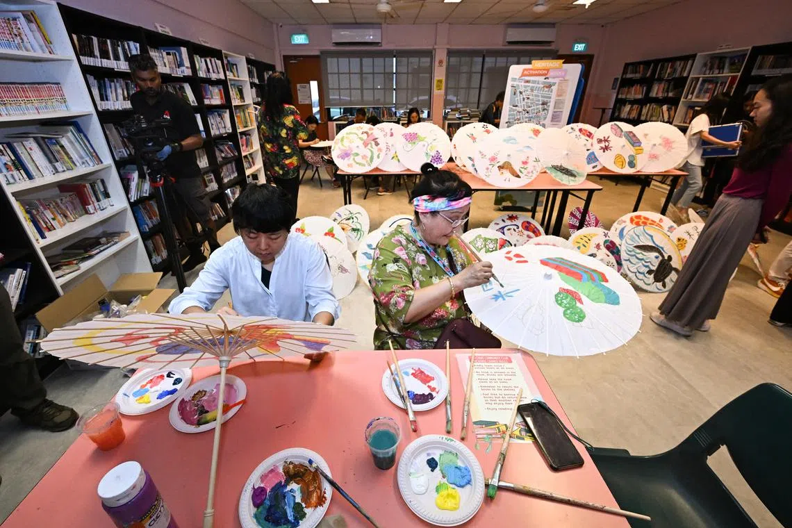 Community members painting paper umbrellas as part of an art creation programme that will take place during the heritage festival.