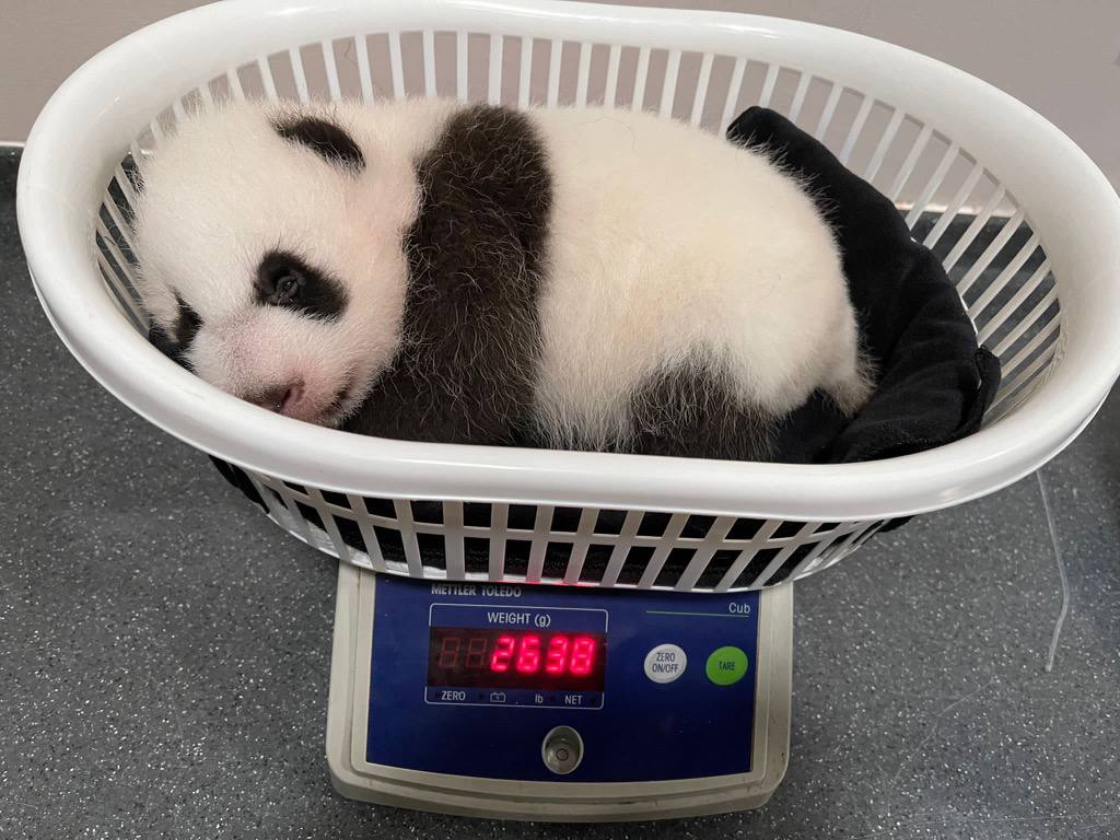 The cub, which is the firstborn of giant pandas Kai Kai and Jia Jia, weighed a healthy 2.638kg on Oct 1, 2021.
