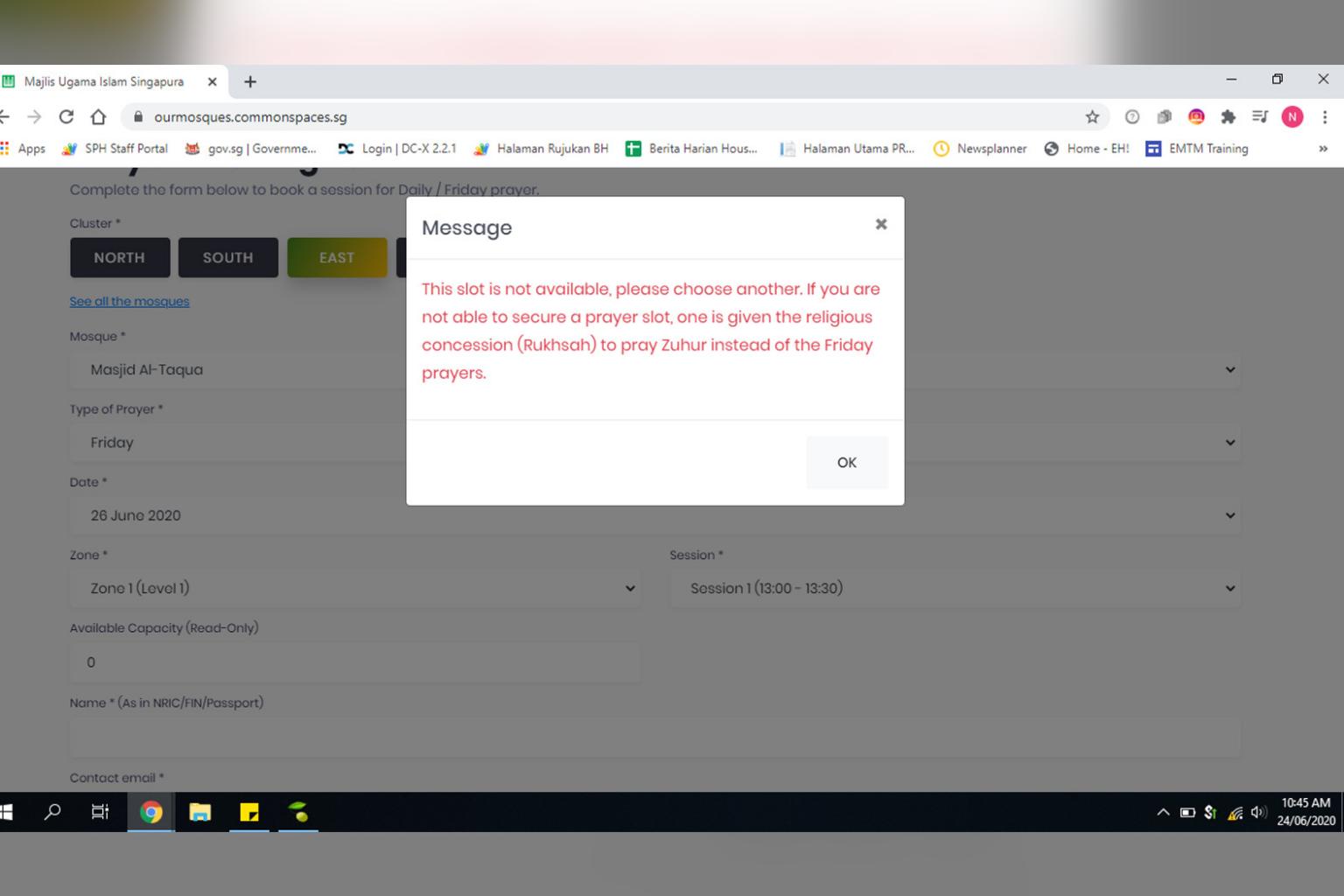 SINGAPORE - All prayer slots for this Friday's (June 26) prayer sessions, the first in about three months, have been booked, announced the Islamic Religious Council of Singapore (Muis) as it acknowledged technical issues in its new mosque booking system.