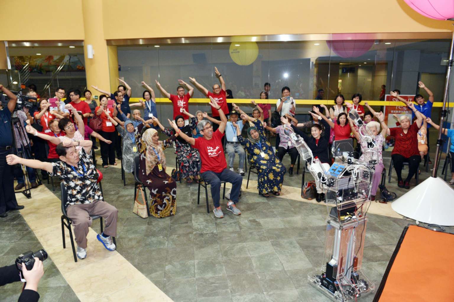 Minister for Information and Communication Dr Yaacob Ibrahim trying out Robocoach together with seniors at the Silver IT Fest at Nanyang Polytechnic yesterday.