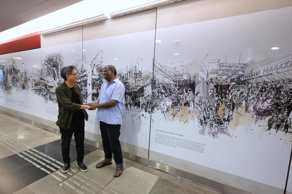 Artist Ronnie Tan and the owner of the former Thambi Magazine Store, Mr Senthil Murugan, in front of a Comic Connect art mural at Holland Village MRT Station.
