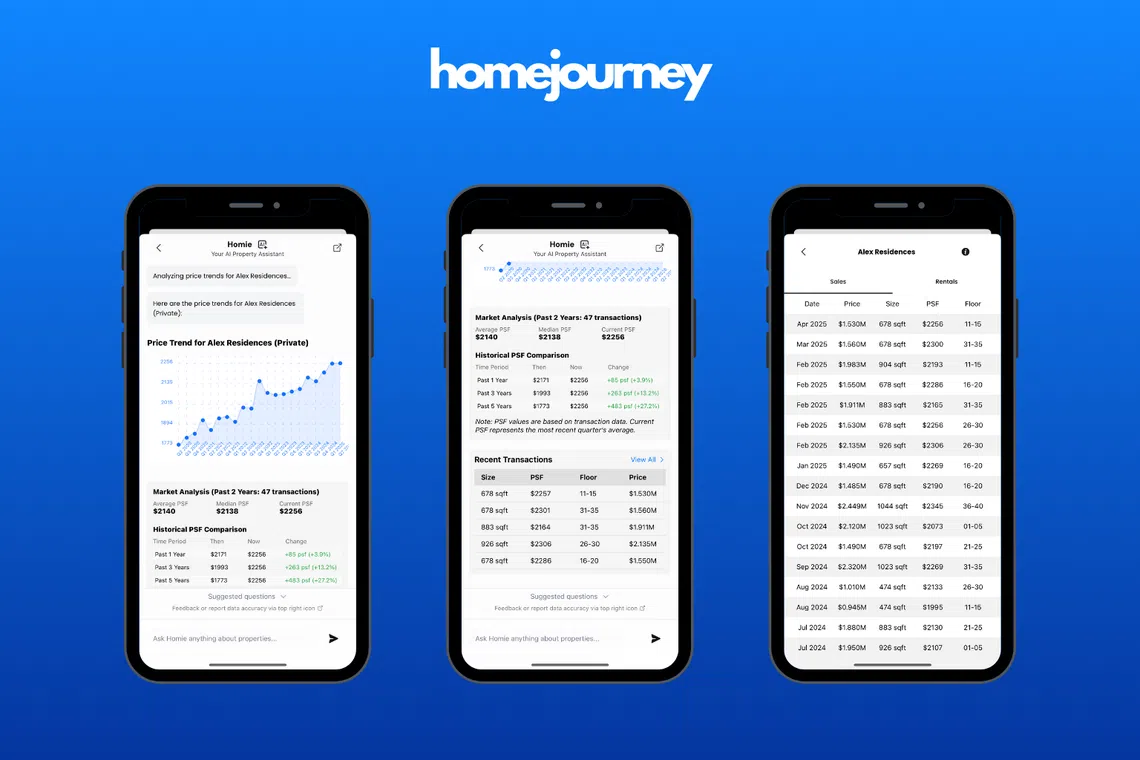 Even after you have made a purchase, Homejourney continues to offer benefits to homeowners with its free-to-use property market analysis tool. Using official property transaction information on recent sales, the Homie chatbot allows homeowners to easily visualise and monitor the value of their properties.