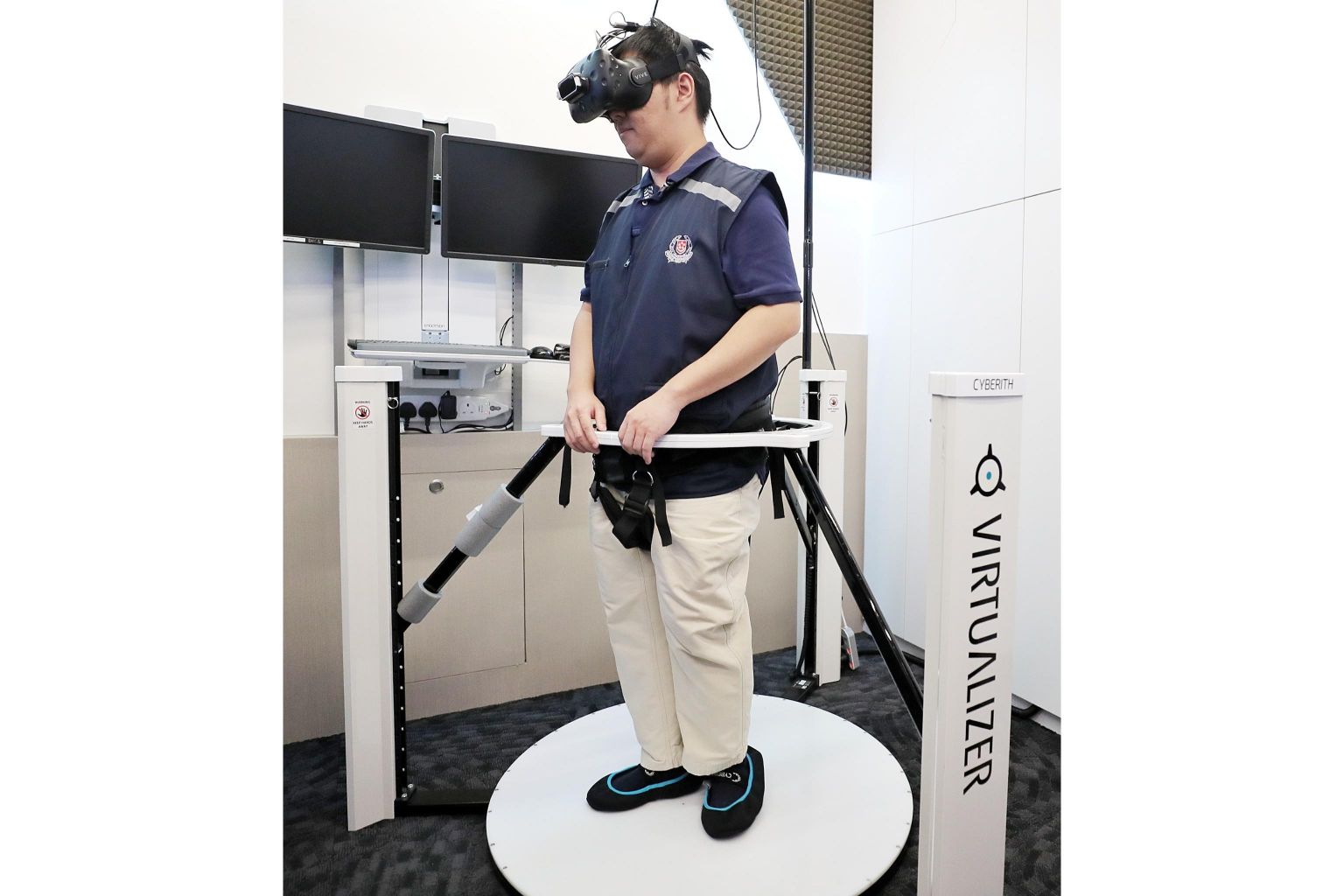 Senior Crime Scene Specialist Wong Jun Yan wearing a VR headset linked to a multi-directional treadmill that allows him to walk around a virtual crime scene and interact with it.