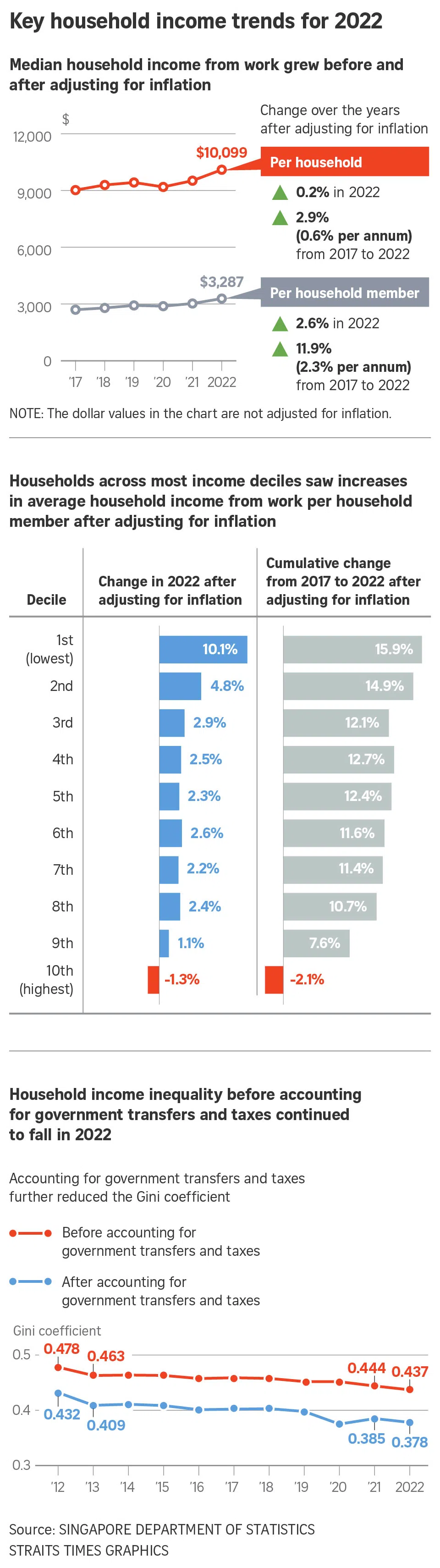 Median monthly household income from work rose 0.2 per cent in real terms, or after adjusting for inflation, in 2022. Household income from work includes employer Central Provident Fund contributions.