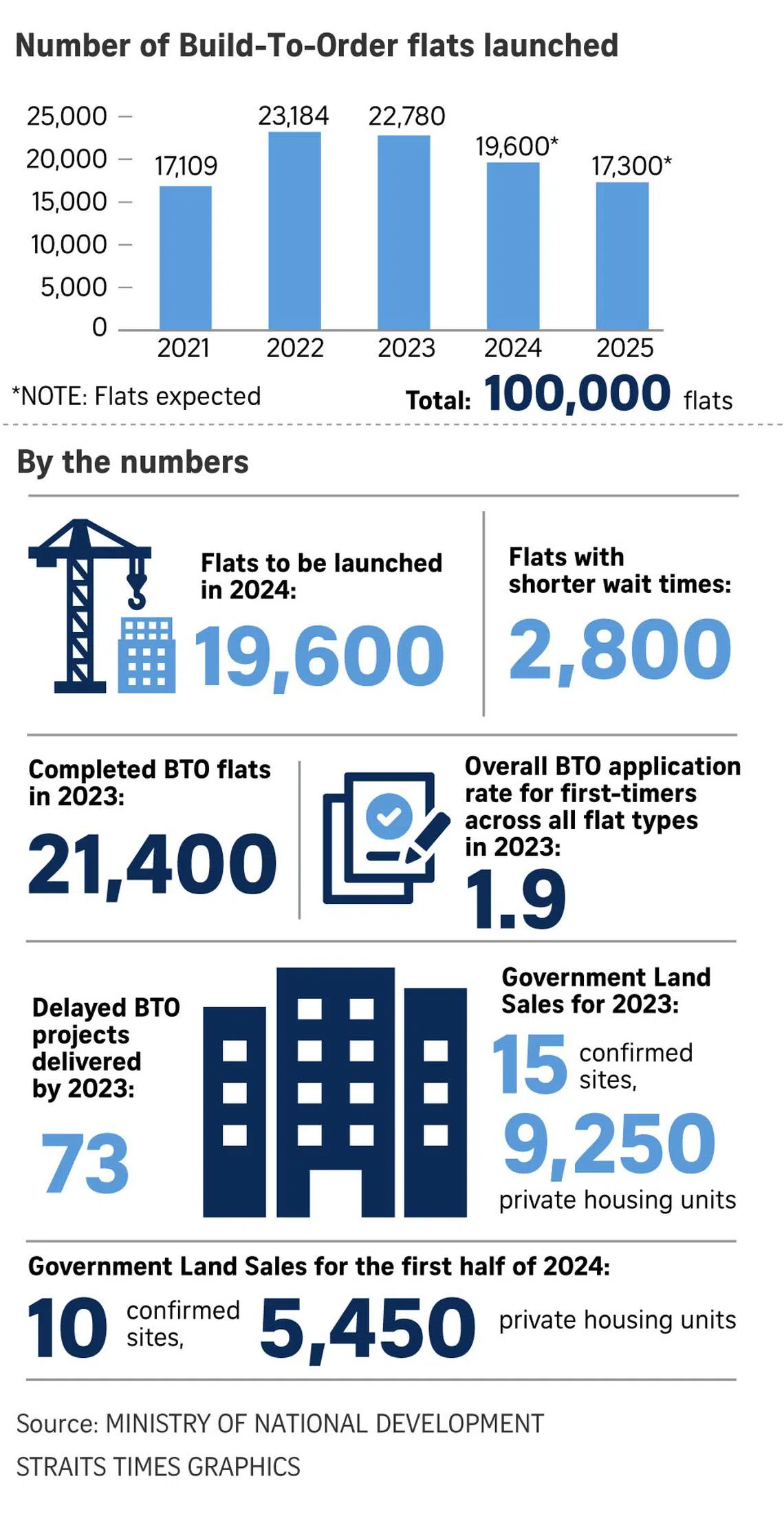 SINGAPORE – Some 19,600 Build-To-Order (BTO) flats will be launched in 2024, including 2,800 flats with shorter waits of below three years.