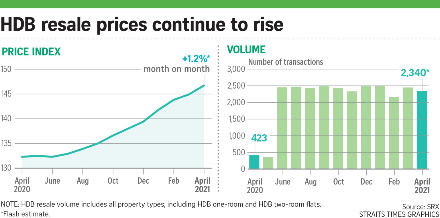 Resale prices climbed 1.2 per cent last month compared with March, according to flash data from real estate portal SRX released yesterday.