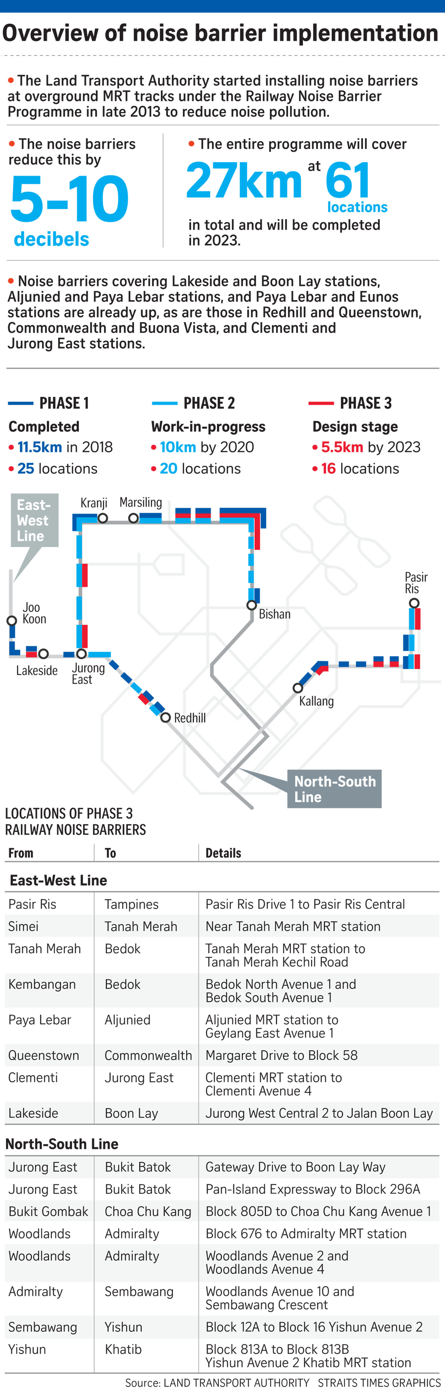 The LTA said that when completed, the noise barriers are expected to reduce railway noise levels by five to 10 decibels.