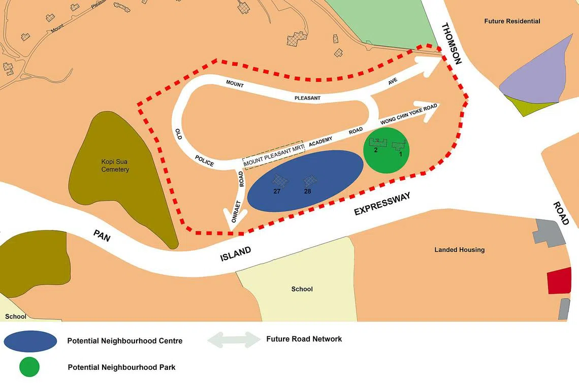 The upcoming Mount Pleasant public housing estate will provide about 5,000 new homes, and will be served by the nearby Mount Pleasant MRT Station and amenities such as a neighbourhood centre and a park.