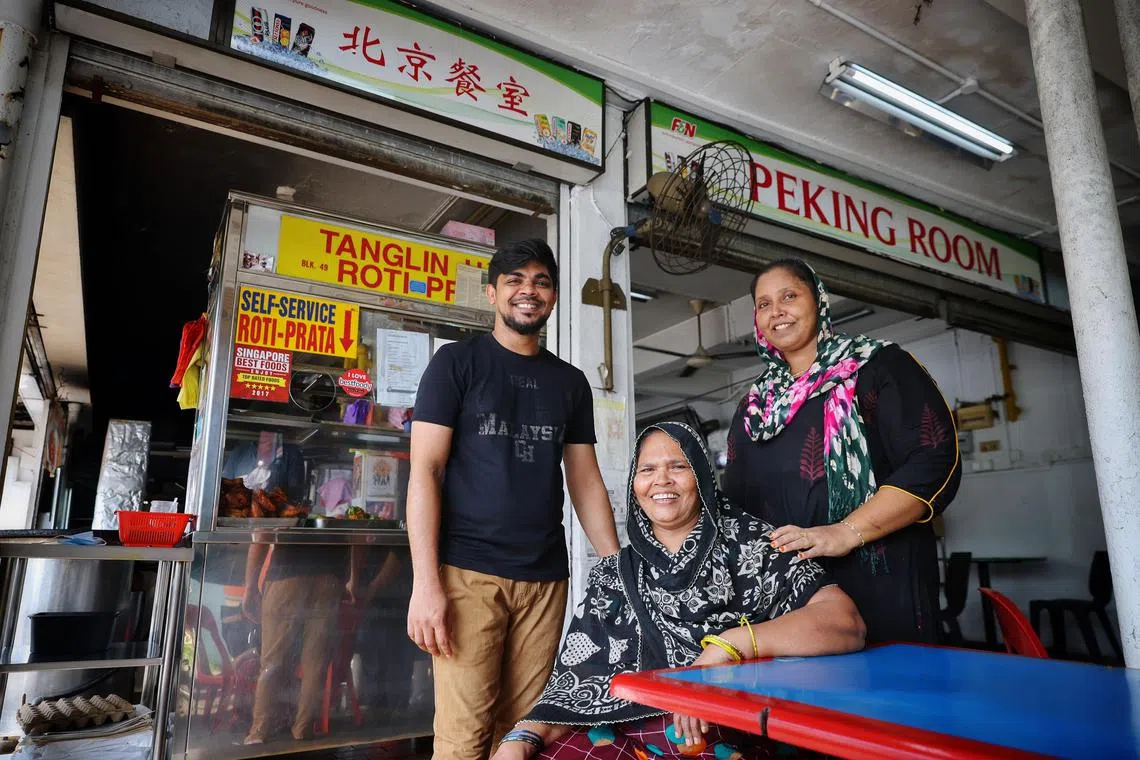 (From left) Mr Mohamed Zayan runs Blk 49 Tanglin Halt Roti Prata with his mother-in-law Kasimeevi Nagoorgani and sister-in-law Fairose Banu.