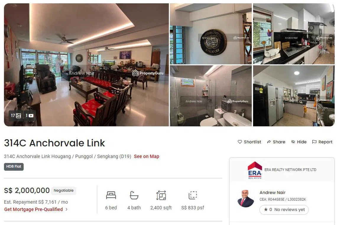 The listing on the PropertyGuru platform for a 2,400 sq ft jumbo flat in Block 314C Anchorvale Link with six bedrooms and four bathrooms was “misleading”, as there are no such flats in the block, the authorities said.