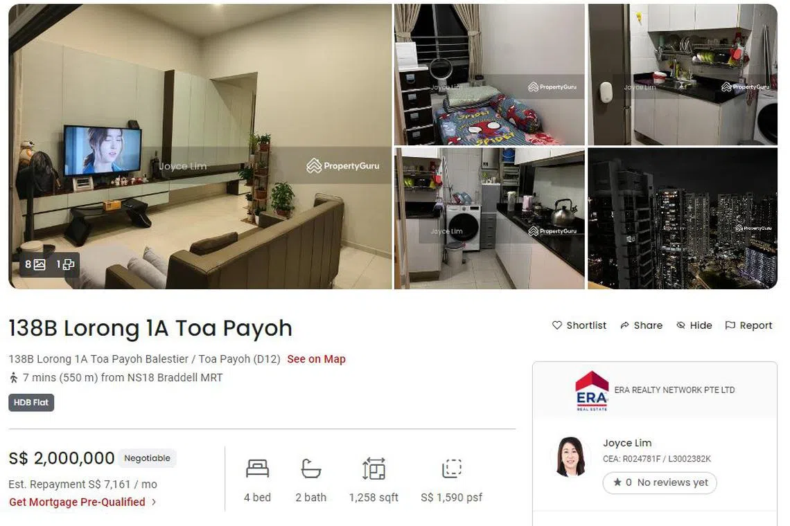Separately, the authorities said a five-room Design, Build and Sell Scheme (DBSS) flat in The Peak@Toa Payoh, which was also listed for $2 million, does not have an intent to sell registered with HDB. This means that the potential seller cannot grant an option to purchase to buyers at this stage. Sellers of HDB flats have to register their intent to sell before they put their flat on the market.