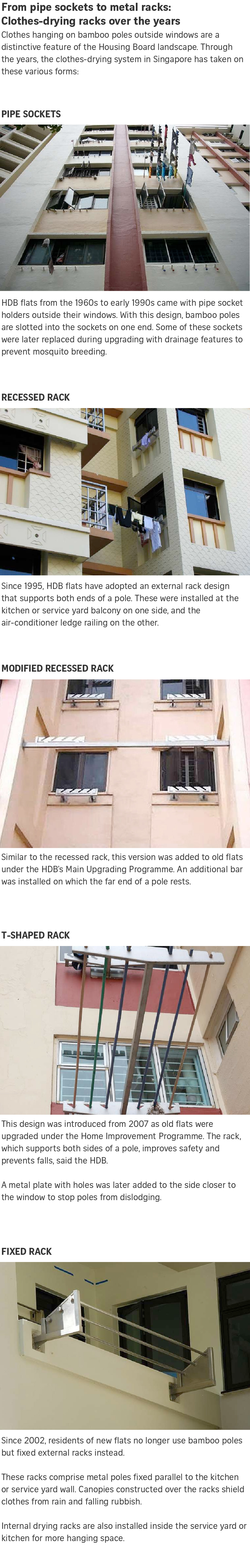The HDB told The Straits Times that some residents at Mr Yeo's block were not using the drying racks correctly. "A few households had either used bamboo poles which were too short, or did not place the poles properly in the laundry racks," it said.