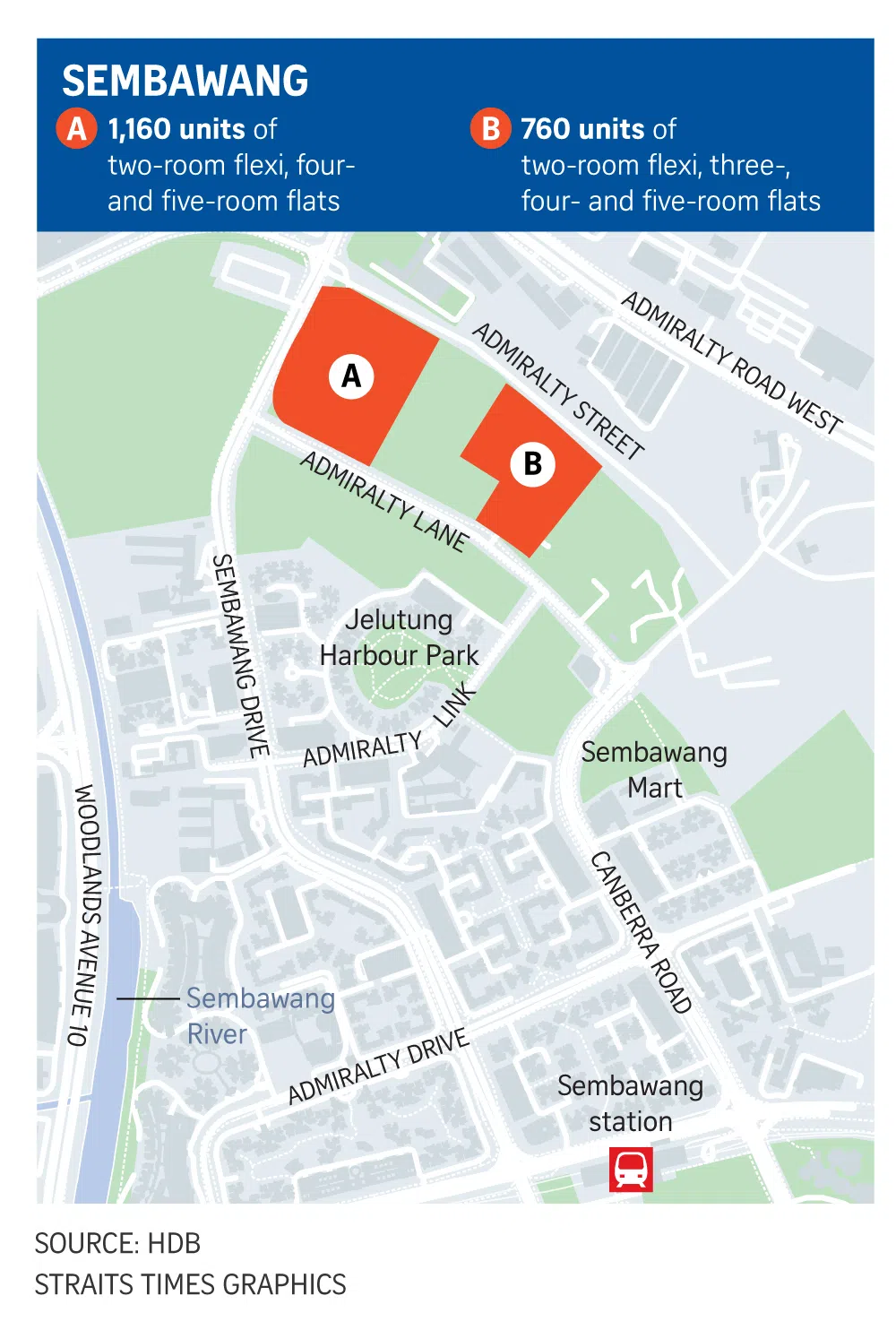 The larger, 1,160-unit project – with two-room flexi, four- and five-room flats – is located in Sembawang Drive. The other project comprises 760 units of two-room flexi, three-, four- and five-room flats. It will also have a pre-school, an eatery, a minimart and shops.