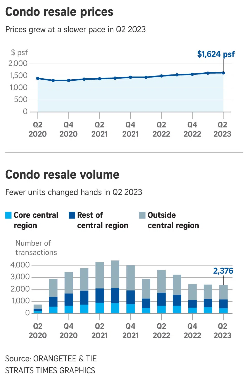 In the second quarter of 2023, resale volumes dipped 1.5 per cent, with 2,376 units changing hands. By comparison, 2,413 units were sold in the first quarter.