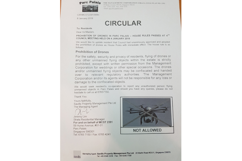 Mr Jeremy Lim, strata residential manager for Parc Palais, said drones fitted with cameras may intrude on privacy.