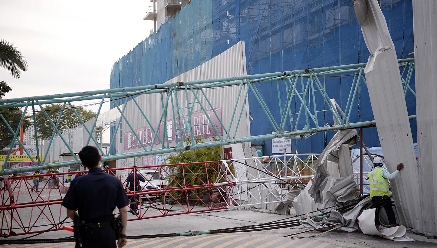 The Workplace Safety and Health Council noted on its website that there have been seven "major crane-related dangerous occurrences" so far this year, compared to 12 for the whole of 2014. These include a mobile crane toppling over at a Jurong worksite on Monday(9mar) and a crane toppling at a Potong Pasir site in February. No one was injured in either incident.