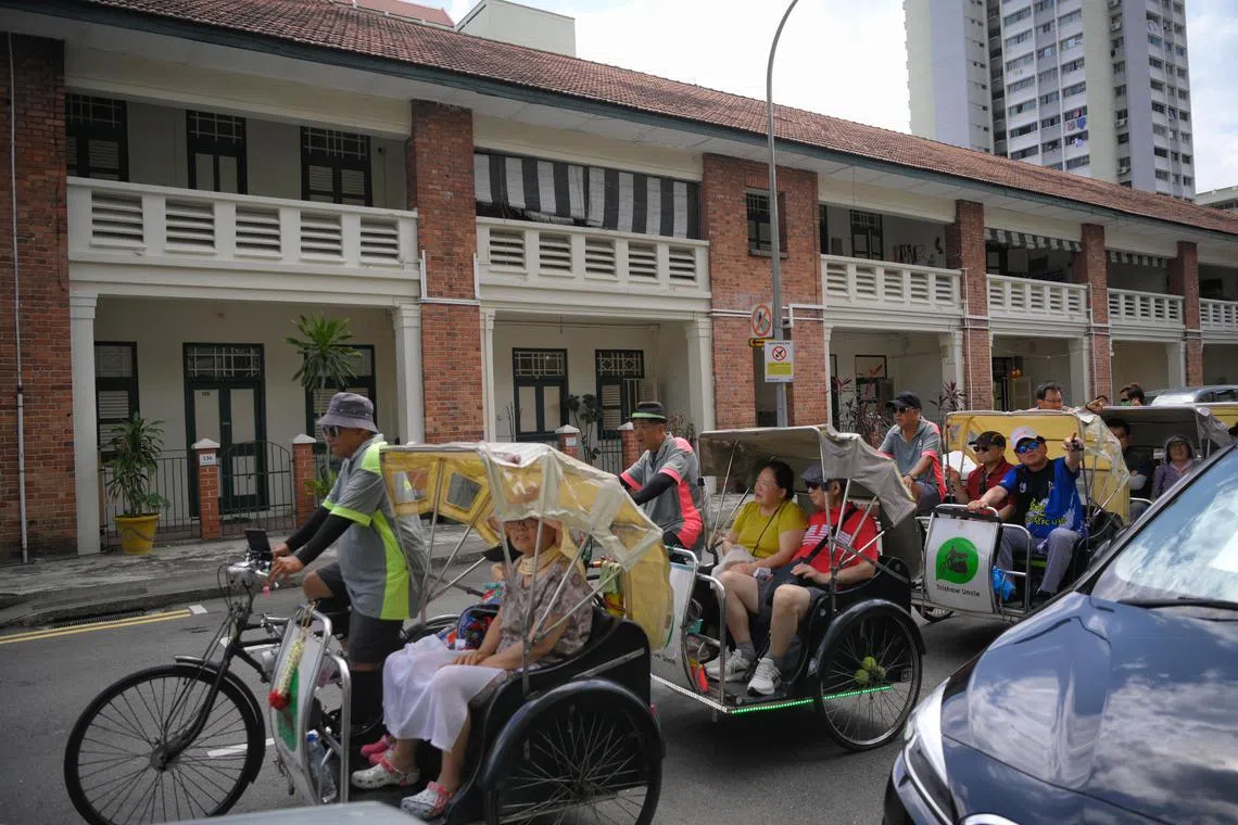 Tourists in trishaws pass by 100 to 116 Rowell Road, on March 17, 2023.