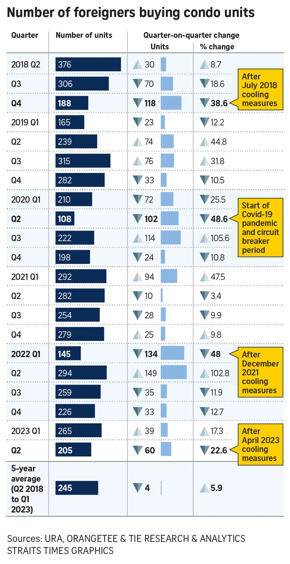 A total of 205 private non-landed homes were bought by foreigners in the second quarter, down 22.6 per cent from 265 units in the previous quarter, a report by OrangeTee & Tie released on Thursday showed. The figures exclude executive condominiums (ECs) which foreigners are not allowed to buy.