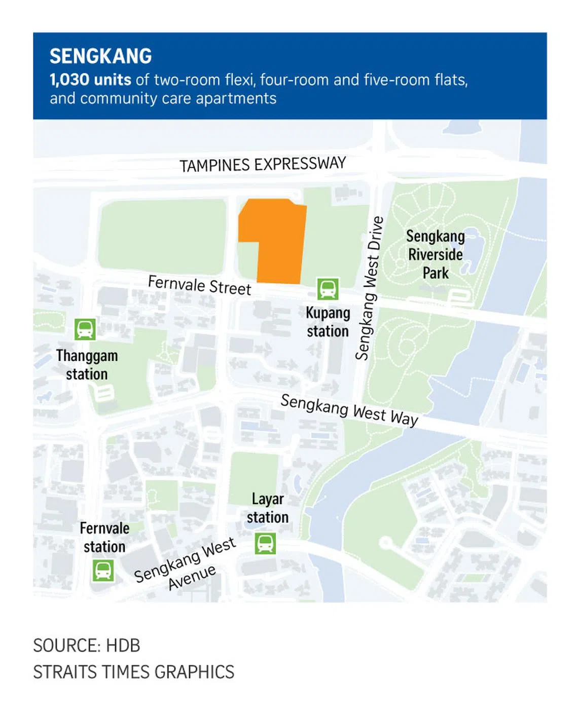 In Sengkang, a site bounded by Fernvale Street and Fernvale Link will house 830 two-room flexi, four- and five-room flats near Kupang LRT station.
