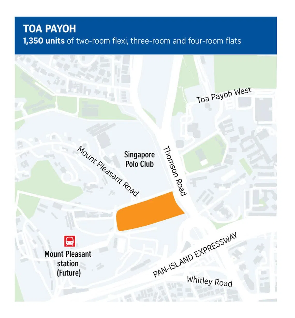 In Toa Payoh, a 1,350-unit project comprising two-room flexi, three- and four-room flats will be built in the new Mount Pleasant housing estate in Thomson Road.