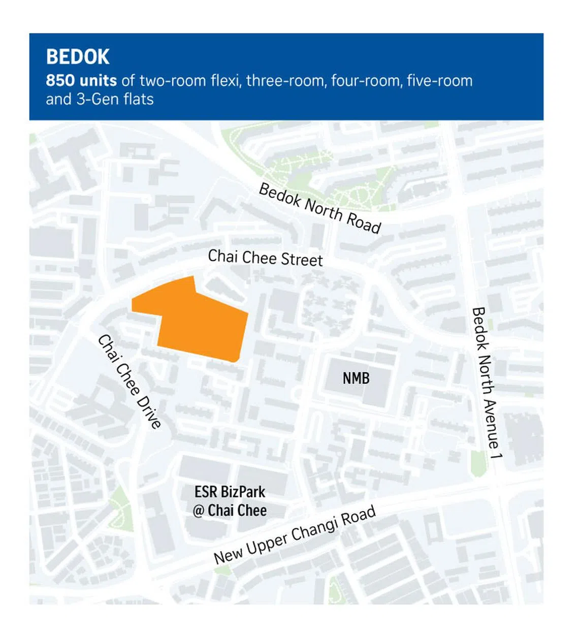The 850-unit project in Bedok will be built in Chai Chee Street. The nearest MRT station is Kembangan, about 1.5km away.