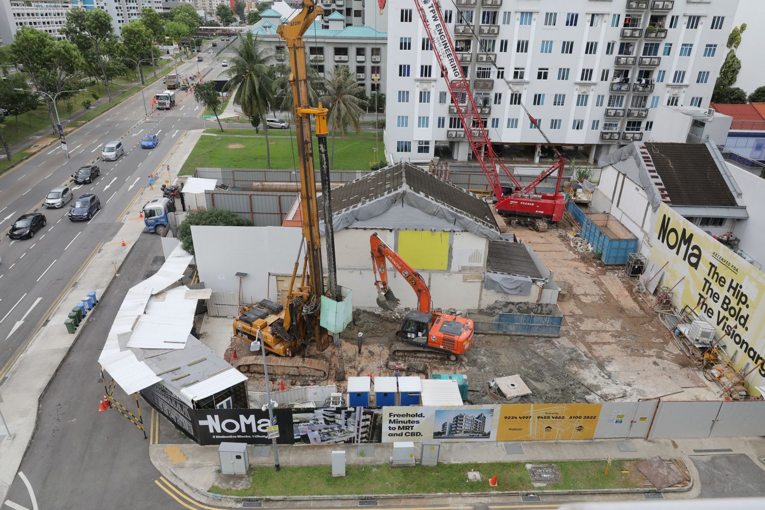 337 Guillemard Road (centre of image) and 54 Lorong 28 Geylang (right) amidst the construction of NoMa condominium.